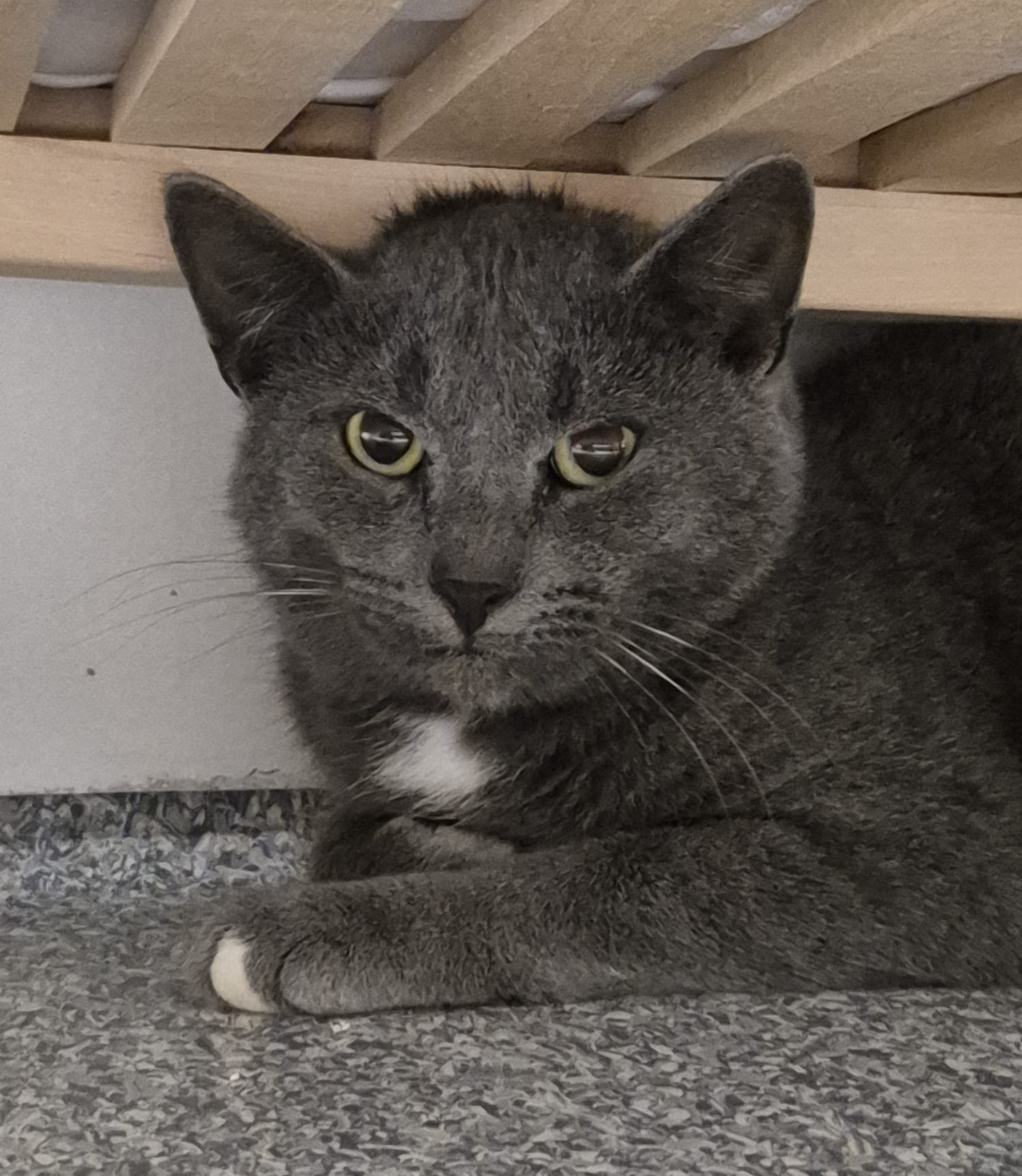 Hopper (25433) viihtyy aikalailla yksikseen, mutta muut kissat ovat hänen mielestään ok. Arka ja aika pelokas.
