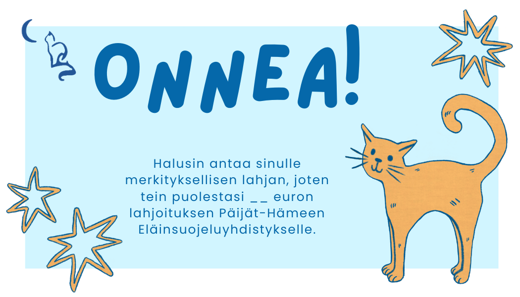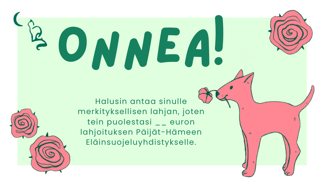 Aineettomalla lahjalla voit muistaa läheistäsi ja ystäviäsi ja samalla tuet Päijät-Hämeen Eläinsuojeluyhdistyksen toimintaa.
